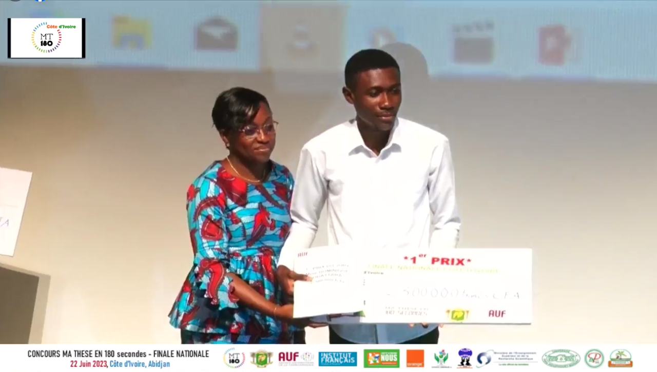 Co-encadré par Béatrice GOURÈNE (Université Nangui Abrogoua, Abidjan) et Jean-Dominique DURAND (IRD, MARBEC) dans le GDRI-SUD WAMBA-Net, Emmanuel N'Guessan KOUAMÉ est en thèse depuis le 1er juillet 2022 à l'École Doctorale Sciences, Technologies et Environnement (ED-STE) en Côte d’Ivoire. Sa participation à la 9ème édition de "Ma thèse en 180 secondes" organisée par L’Agence Universitaire de la Francophonie (AUF), lui a permis de gagner la compétition avec son sujet "Ré-évaluation taxonomique de la diversité des poissons marins de Côte d’Ivoire par l’approche de barcoding ADN". Cet événement est l'opportunité pour les jeunes chercheurs de diffuser en 180 secondes leur recherche en français dans un espace public.