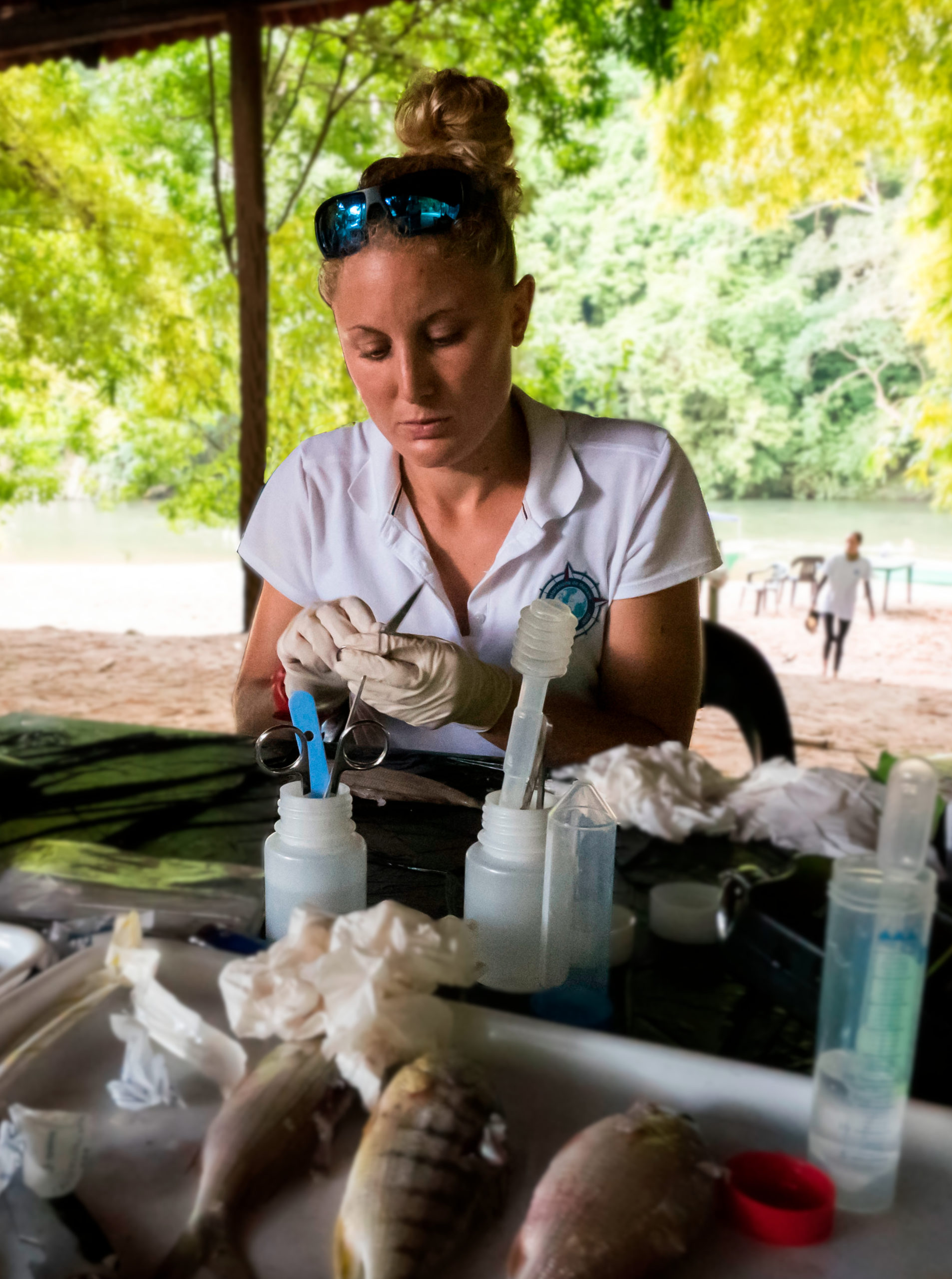 Les Explorations de Monaco : Laboratoire mobile : Analyse sur le terrain et prélèvement écailles et ADN sur les poissons récupérés chez les pêcheurs locaux. Megafauna / Invamar / Marbec, Santa Marta, Colombie Octobre 2018. @Olivier Borde / EDM