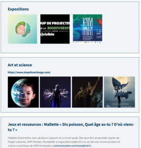 D'autres actions visent à encourager et à organiser, sur les divers lieux d'implantation du laboratoire dans le monde, la participation individuelle de scientifiques de l'UMR, à diverses initiatives ou manifestations existantes (Aires Marines Éducatives, Fête de la Science, Fête de la Nature, programme Graines de Reporters scientifiques de la Fondation Tara, Escale à Sète, collaborations arts-sciences, etc.).